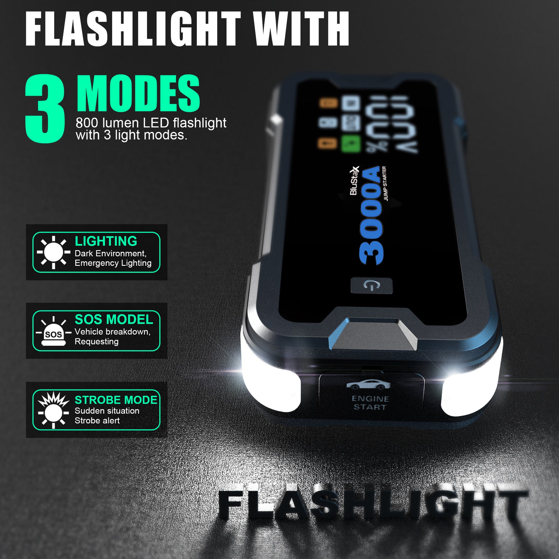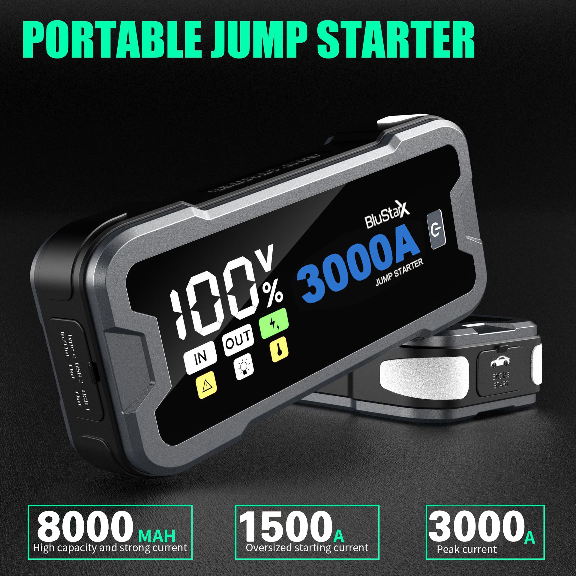 - ⚡ 12V Portable Jump Starter: 3000A peak current, easily jump-starts 3.5L gasoline vehicles and 2.8L diesel vehicles, stable operation from -20°C to 60°C.
